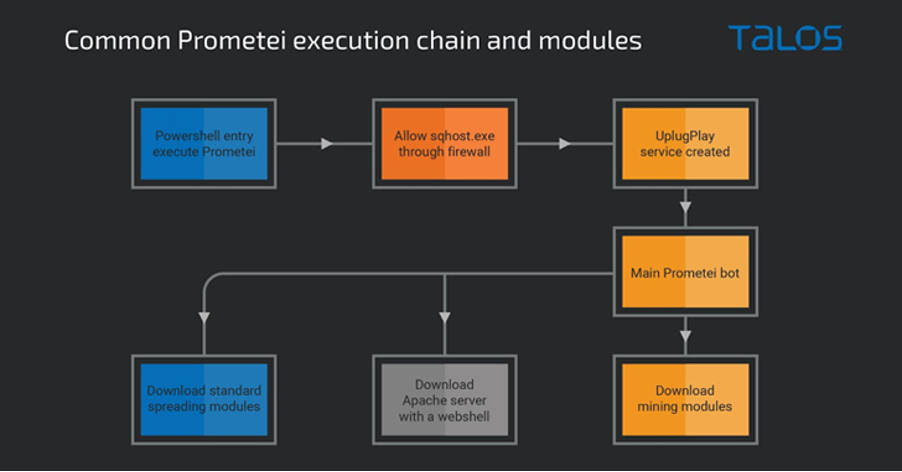 ลำดับการโจมตีดำเนินไปดังนี้: เมื่อตั้งหลักได้สำเร็จ คำสั่ง PowerShell จะถูกดำเนินการเพื่อดาวน์โหลด Malware Botnets จากเซิร์ฟเวอร์ที่อยู่ระยะไกล จากนั้นโมดูลหลักของ Prometei จะถูกใช้เพื่อเรียกลักลอบขุด crypto ในระบบ